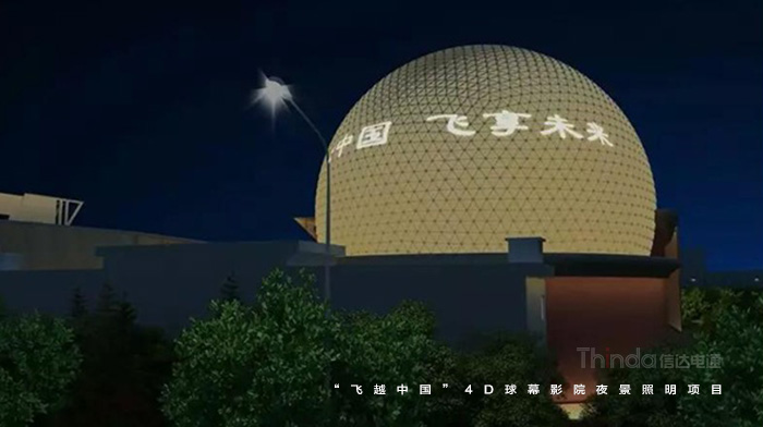 隨著球幕外立面光色切換,“我愛你中國”、“飛覽天下飛越中國”等主題字幕滾動播出。為實現(xiàn)預(yù)期的設(shè)計效果,信達團隊多次夜間試燈。