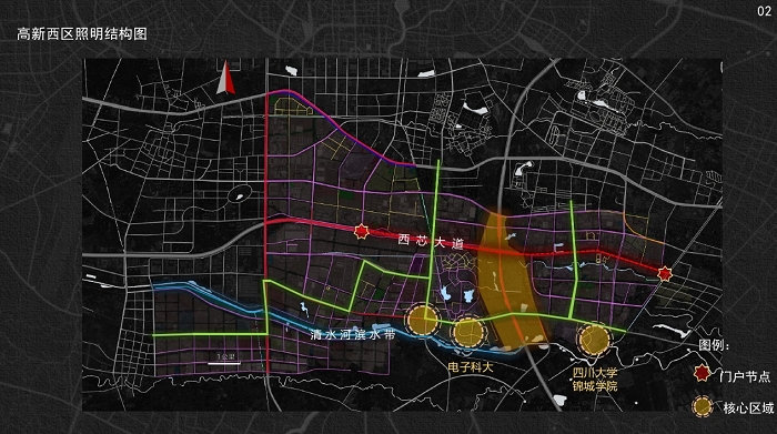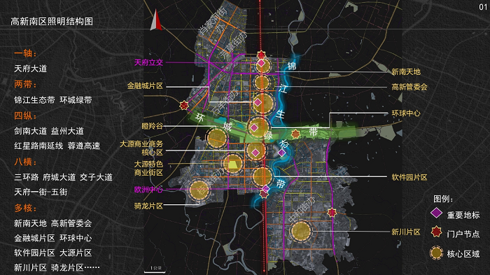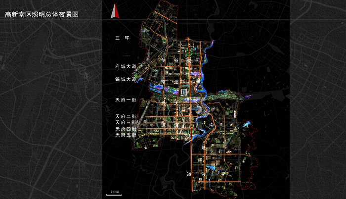 高新南區以天府大道為中軸線,形成一軸、兩帶、四縱、八橫、多核的照明結構。
