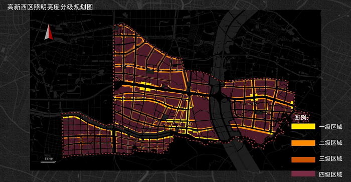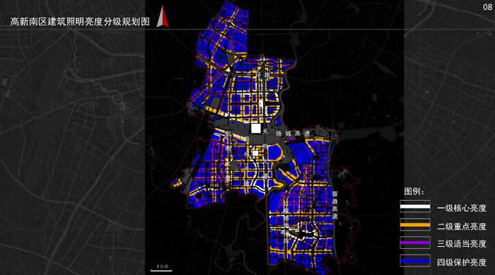 對多個核心地帶采用一級照明,商圈等重點區域采用二級照明,公園等公共區域采用三級照明,住宅地區采用四級照明。
